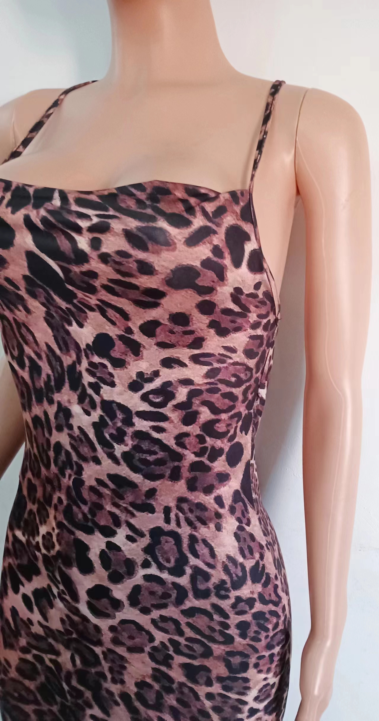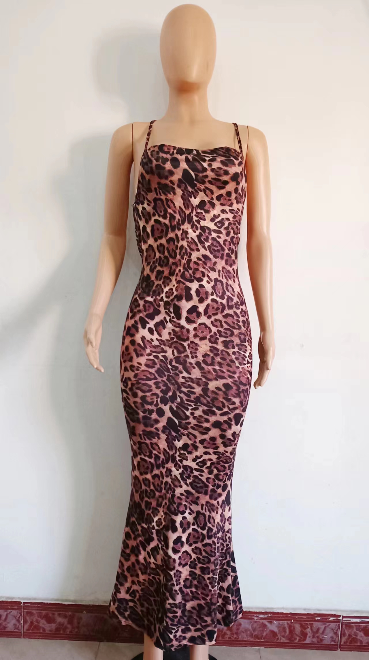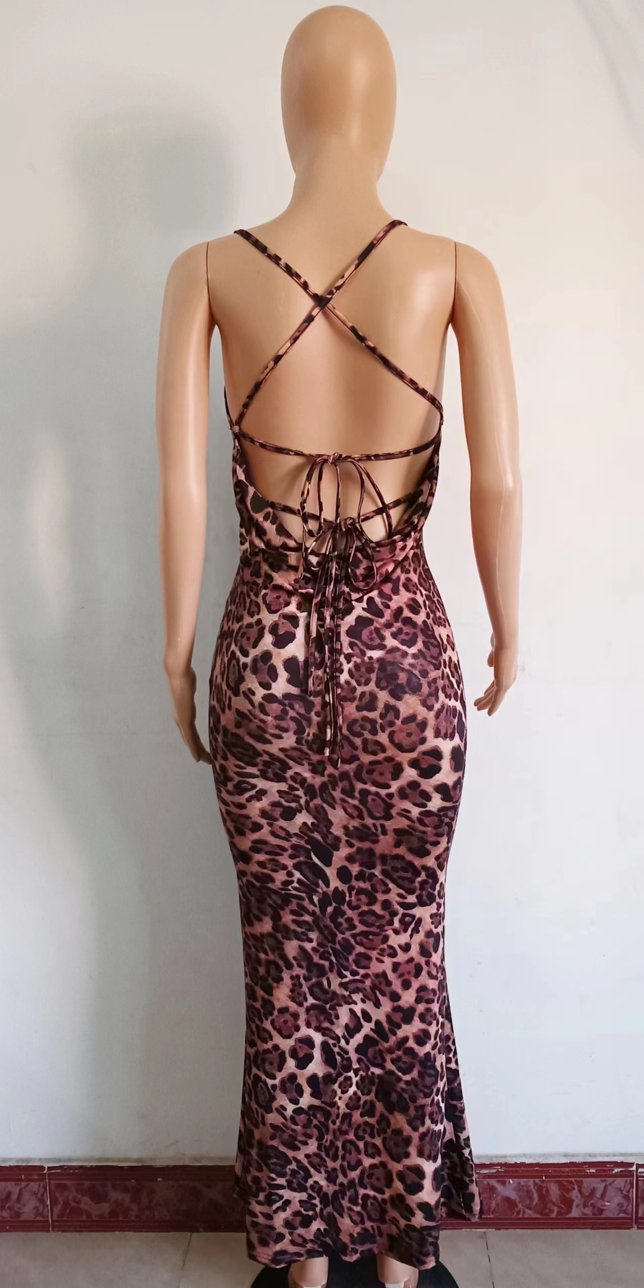 Vestido Verão sem costas sexy vestido de noite feminino moda elegante leopardo impressão rendas fino ajuste vestidos longos